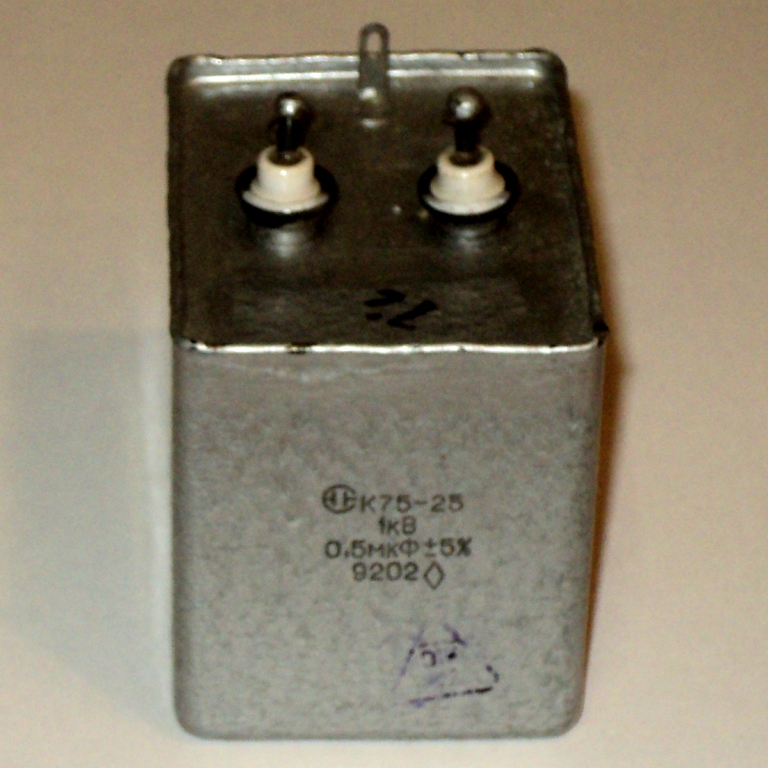 К75-25 1КВ 0.5мкФ конденсатор комбинированный, фольговый, уплотненный, неизолированный, постоянной емкости, предназначен для работы в качестве встроенных элементов внутреннего монтажа аппаратуры (в кожухе комплектного изделия) в цепях постоянного и пульсирующего токов и в импульсных режимах с частичной разрядкой емкости.